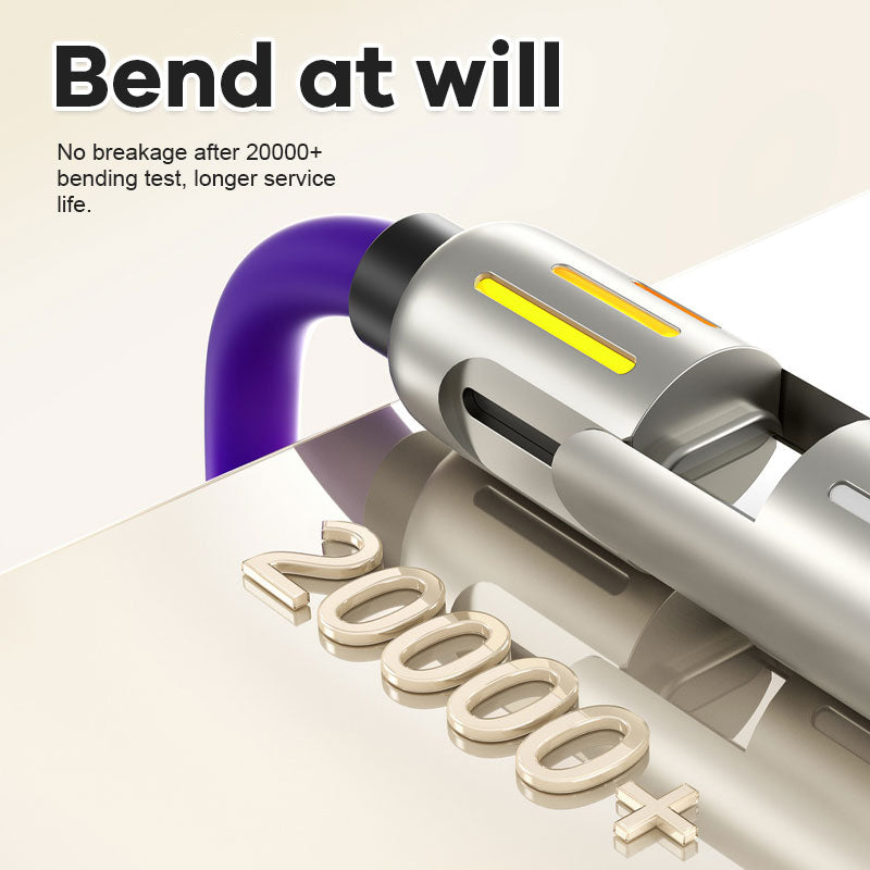 Erleben Sie Komfort und Effizienz auf höchstem Niveau mit unserem 4-in-1-Schnellladedatenkabel. Das leuchtende Licht erhellt Ihr Ladeerlebnis. Dieses innovative Kabel sorgt dafür, dass alle Ihre Geräte schnell und zuverlässig geladen werden, egal wo Sie sind.