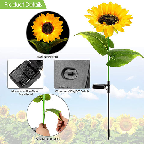 - 🌻【Realistische, schöne Sonnenblume】Diese Solar-Blumenlichter enthalten 2 Packungen Sonnenblumenlichter. Die künstlichen Sonnenblumenblätter bestehen aus Stoff, der exquisit gestaltet ist, um echte Sonnenblumen zu imitieren. Diese wunderschönen Sonnenblumen verleihen der Nacht eine vage Schönheit und sind der letzte Schliff für Ihren schönen Garten.